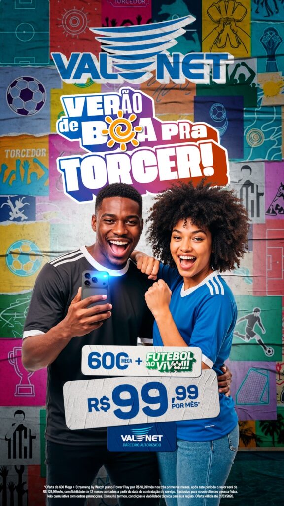 Oferta de 600 Mega + Streaming com Tv ao vivo by Watch plano Power Play por R$ 99,99/mês nos três primeiros meses, após este período o valor será de R$ 129,99/mês, com fidelidade de 12 meses contados a partir da data de contratação do serviço. Exclusivo para novos clientes pessoa física. Não cumulativa com outras promoções. Consulte termos, condições e viabilidade técnica para sua região. Oferta válida até 31/03/2026.
