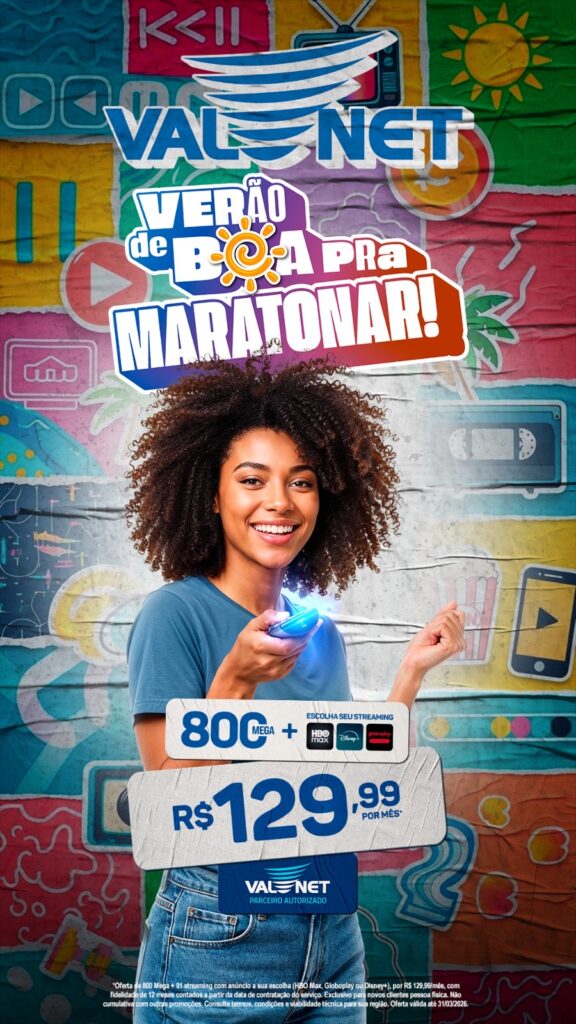 Oferta de 800 Mega + 01 streaming com anúncio a sua escolha (HBO Max, Globoplay ou Disney+), por R$ 129,99/mês, com fidelidade de 12 meses contados a partir da data de contratação do serviço. Exclusivo para novos clientes pessoa física. Não cumulativa com outras promoções. Consulte termos, condições e viabilidade técnica para sua região. Oferta válida até 31/03/2026.